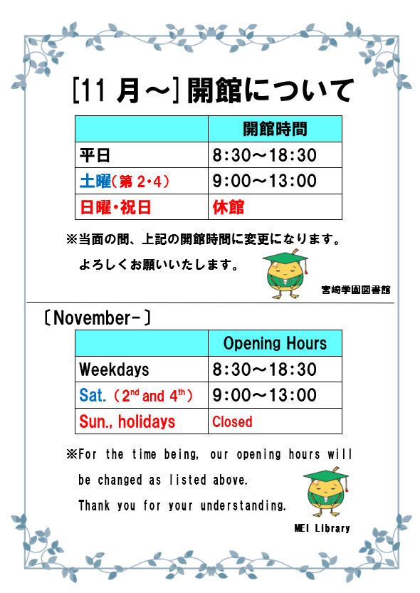 11月からの開館時間の変更を予定しておりましたが、再度見直しにより、